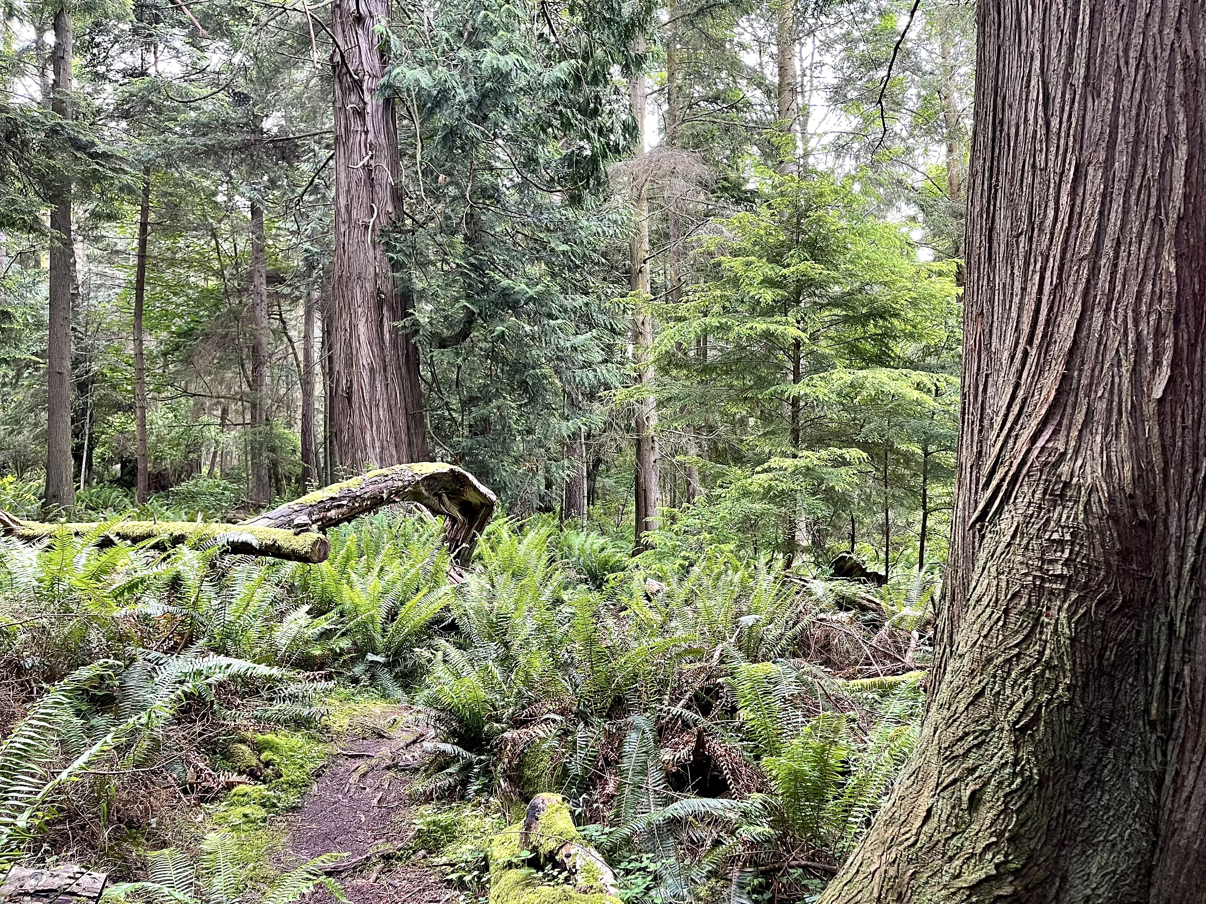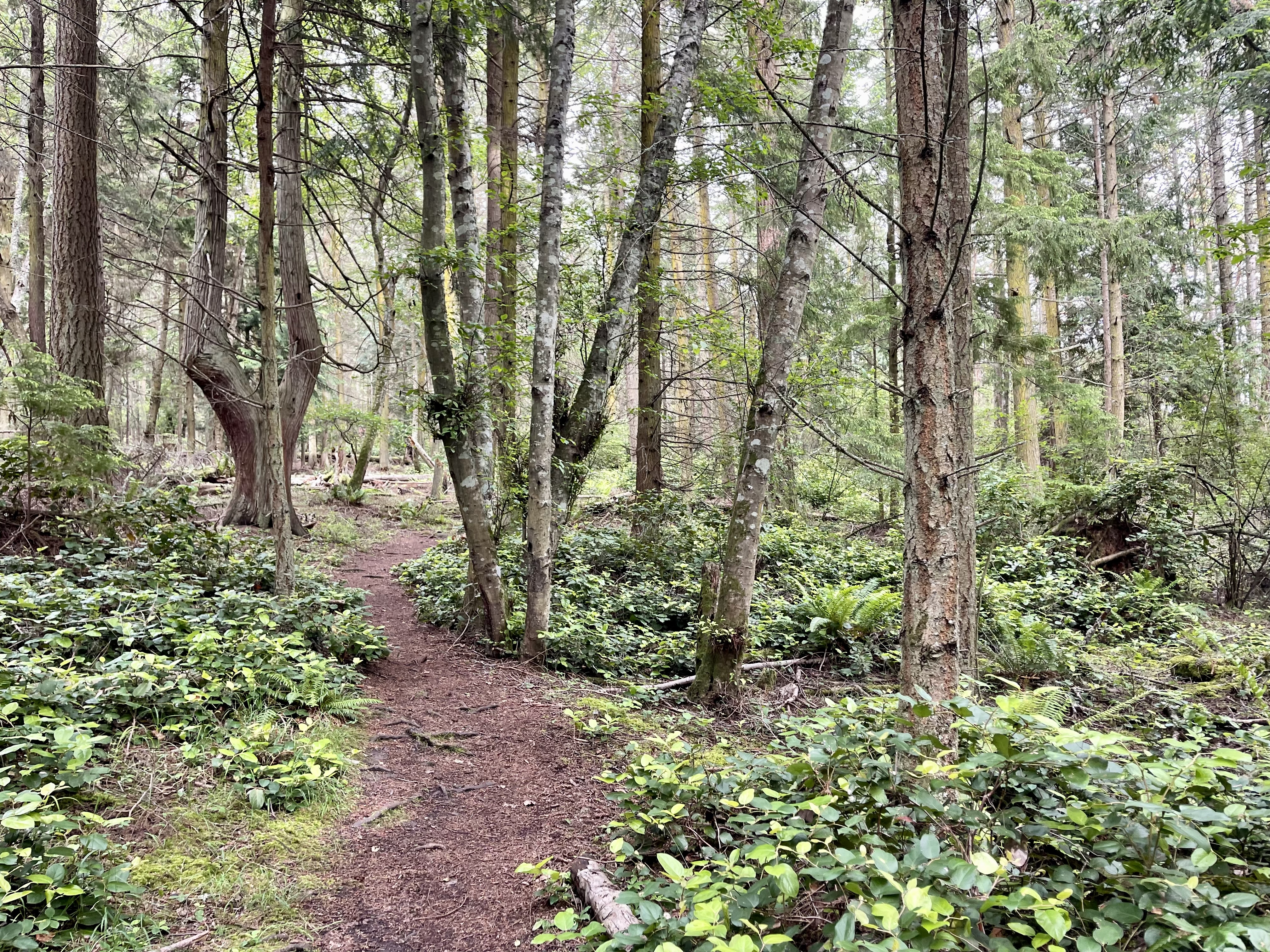 The 2.2 miles loop in Washington Park provides stellar views of Puget Sound and the surrounding San Juan Islands. Besides the water views it has a lush thick forest with big firs, and lots of ferns. It is absolutely beautiful. Still, being someone that wants to get away and really immerse myself into nature I was a little disappointed that I was walking along a single lane roadway with cars going by once in a while. However, about half way through my walk I found the trails and then I was in hog heaven, as this was exactly what I was looking for. Maybe even a bit more as one trail I took me on a tiny trail, slippery with mud, with a steep short grassy hill sloping dramatically to a cliff with a drop either onto rocks far below or into the sound and with no way back. So once it went from sketchy to hair ball, (That is when it also added some scrambling), I said to myself, “this is a view to die for” literally! That is the point were I retraced my steps to a more moderate version on a PNW trail.